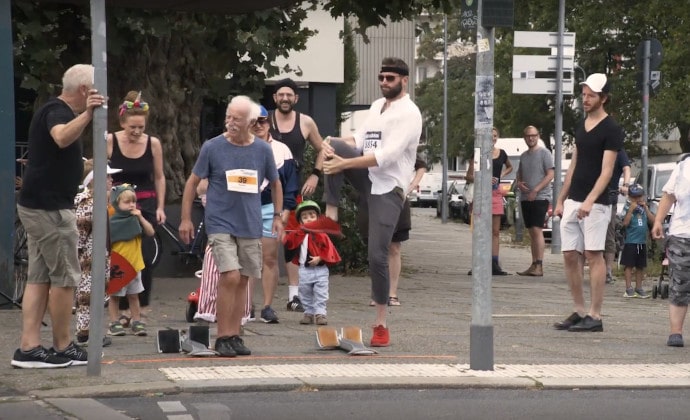 Pour dénoncer ce phénomène, l’organisation allemande « Changing cities » a organisé en août la première « Course contre le feux » (Ampelwettlauf) réunissant des faux sportifs de tous âges. Dossards, starting-blocks, commentatrice sportive, on s’y croirait presque. L’endroit choisi, la Bismarckstraße, est une 2×2 voies très circulées.